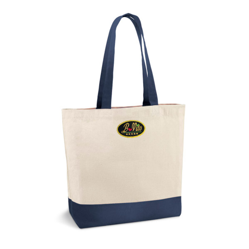 Sac en coton plein avec poignées colorées et poche intérieure.