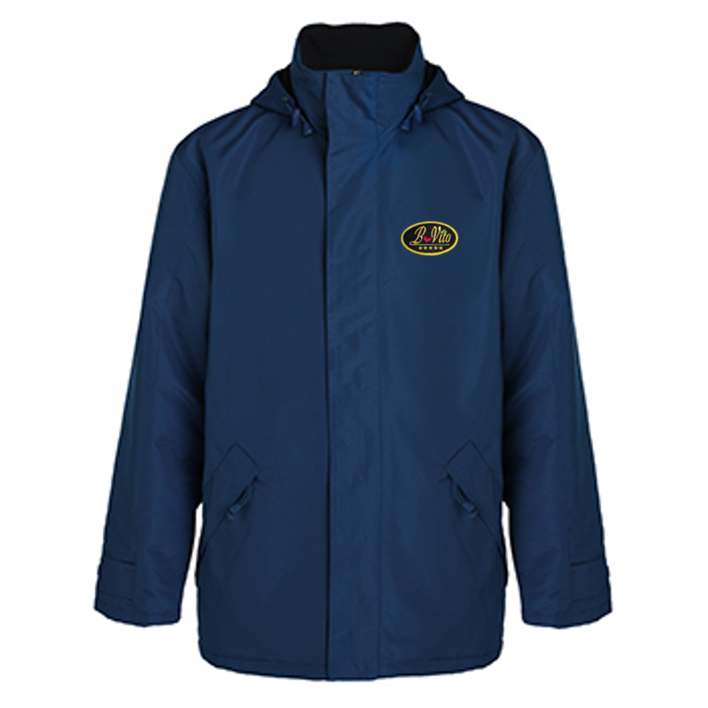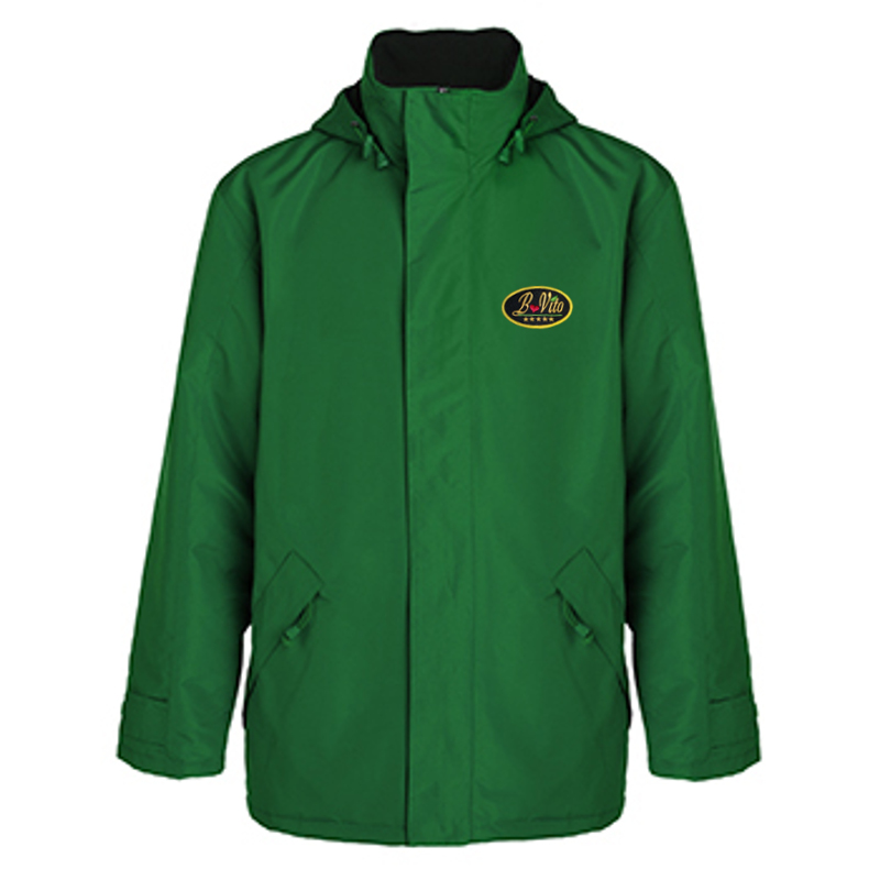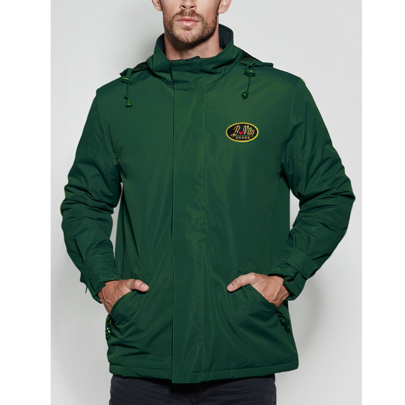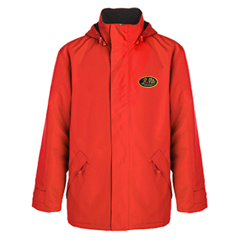 Blouson élégant avec deux poches extérieures possédant une fermeture à glissière, un couvercle pour une fermeture pratique. Il a deux poches intérieures avec fermeture velcro, des poignets réglables avec velcro et capuche réglable rétractable. De l'extérieur, il est recouvert de couverture en polyester 100% coupe vent et imperméable.
